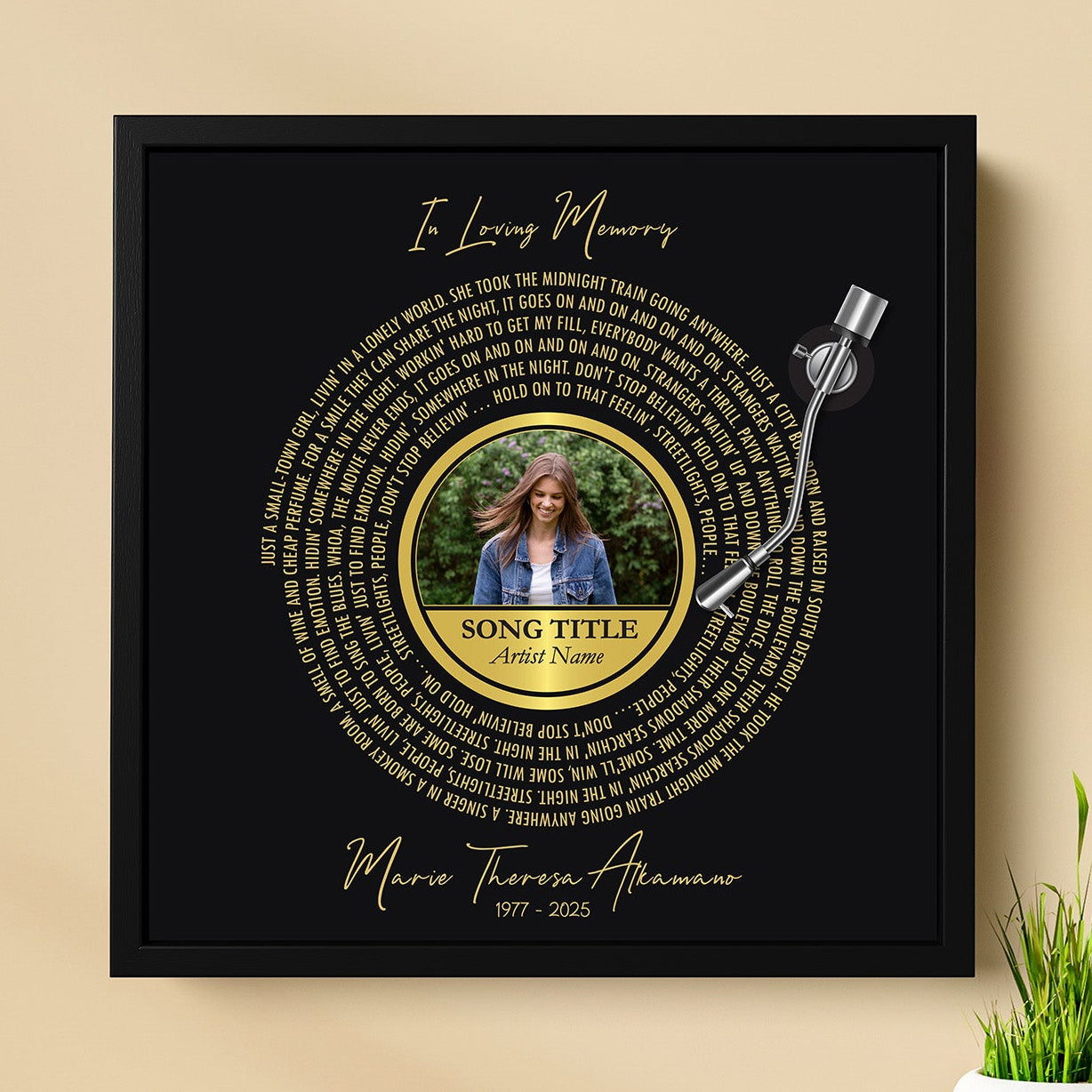 Honor a beautiful life with a truly meaningful tribute. Our Custom Framed Memorial Canvas combines your loved one’s photo and favorite song lyrics into a stunning piece of wall art that keeps their memory alive every day.